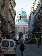 少し行くと、コールマルクト通りとグラーベン通りの交差点に出ます。こちらはコールマルクト通り。奥に見えるのは王宮のミヒャエル門です。